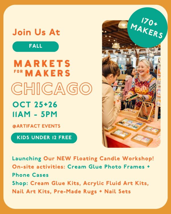 Come visit us at the Makers Market at Artifact Events Chicago to grab your coupon — and while you’re there, check out our booth full of creative goodies: Cream Glue Kits, Acrylic Fluid Art Kits, Nail Art Kits, Pre-made Rugs, Pre-made Nail Sets, and Special-Priced Workshops.